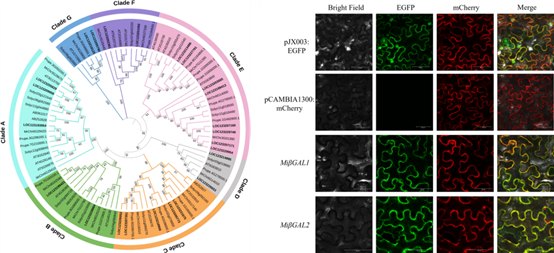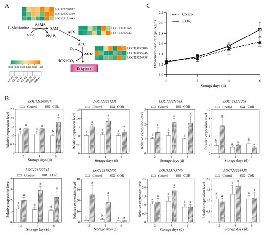 进一步在芒果中系统鉴定了24个Miβ-GAL家族基因,并分析了它们的表达模式、进化关系及启动子顺式元件,发现多个基因与激素响应和逆境应答密切相关。其中,Miβ-GAL2在外源COR诱导下显著表达。亚细胞定位分析显示Miβ-GAL2定位于细胞膜。为了进一步验证Miβ-GAL2的功能,利用果实瞬时过表达技术,发现过表达芒果果实中Miβ-GAL2表达量与β-GAL酶的活性显著提高。RNA测序表明乙烯合成关键基因(MiSAMS、MiACS和MiACO)的表达在外源COR的诱导下也显著上调。