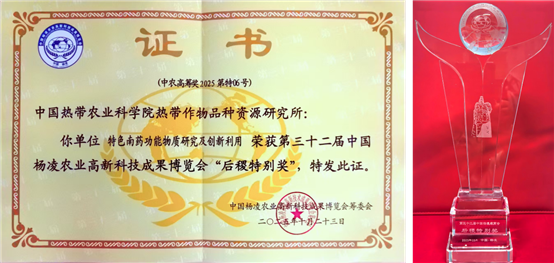 近日,第32届中国杨凌农业高新科技成果博览会“后稷奖”获奖名单正式公布。中国热带农业科学院热带作物品种资源研究所南药与健康研究中心研发的“特色南药功能物质研究及创新利用”技术荣获“后稷特别奖”。